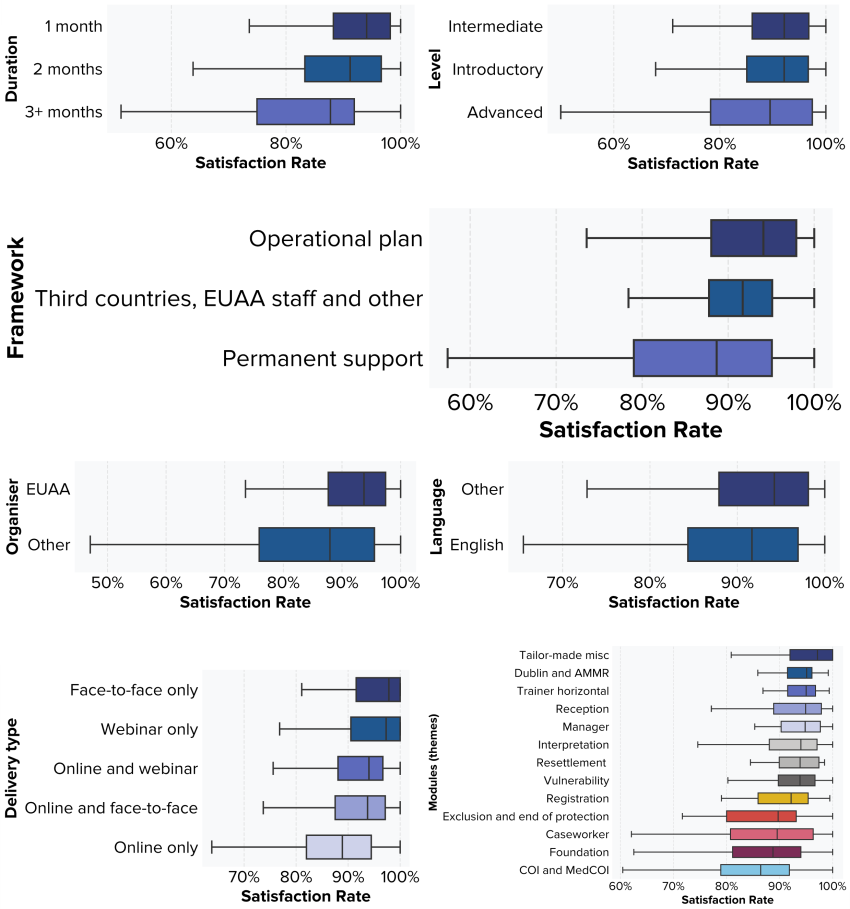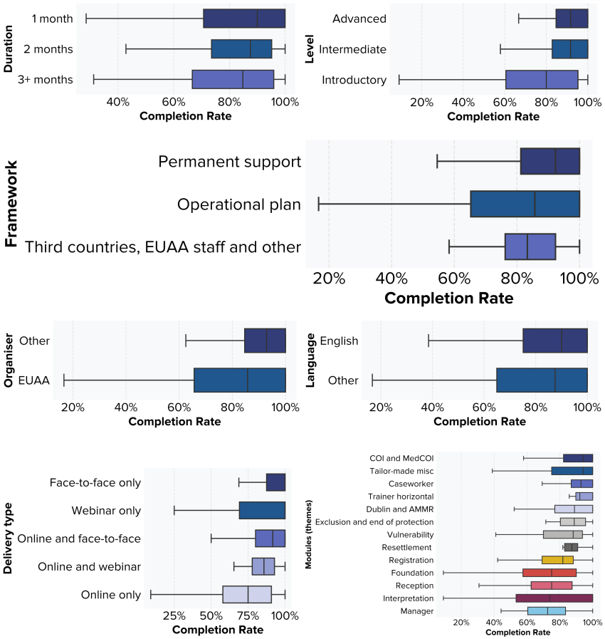 Two response variables (i.e. outcome measures) – completion rate and satisfaction – are considered in detail. Each is explored by means of its associations with one or more explanatory variables, e.g. delivery type (i.e. mode), duration, language (English vs other), organiser (EUAA vs other), level (introductory, intermediate or advanced), framework (permanent, operational, or third country), and module category (13 themes).