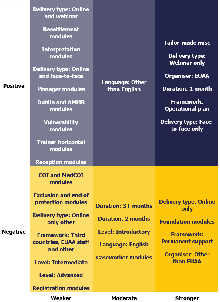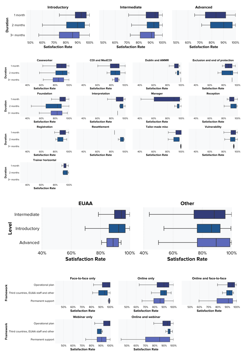 • Duration: Although longer modules generally show lower satisfaction rates (suggesting fatigue or unmet expectations), this effect remains consistent across most organisers, languages, modalities and support types, as well as for both introductory and intermediate levels. Conversely, the association does not hold for advanced-level modules or for several specific module categories – ‘COI and MedCOI’, ‘Dublin and the AMMR’, ‘Exclusion and end of protection’, ‘Manager’, ‘Reception’, ‘Tailor-made misc.’, ‘Resettlement’ and ‘Trainer horizontal’ where longer sessions do not necessarily reduce satisfaction.