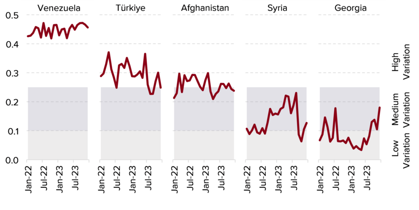 In general, a variation score between 0 and 0.1 is considered to be low, between 0.1 and 0.25 as medium, and above 0.25 as high.xlAs seen in Figure 19, Venezuela had the highest variation in recognition rates in the past 2 years, as the monthly scores always remained above 0.42 and were often above 0.45. Nationals of Türkiye also had continuously high variation in recognition rates, with the standard deviation oscillating around 0.3.