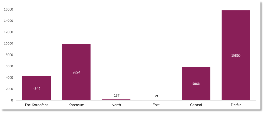 Figure 2: Breakdown by region of number of incidents recorded by ACLED between 15 April 2023 and 21 March 2025.