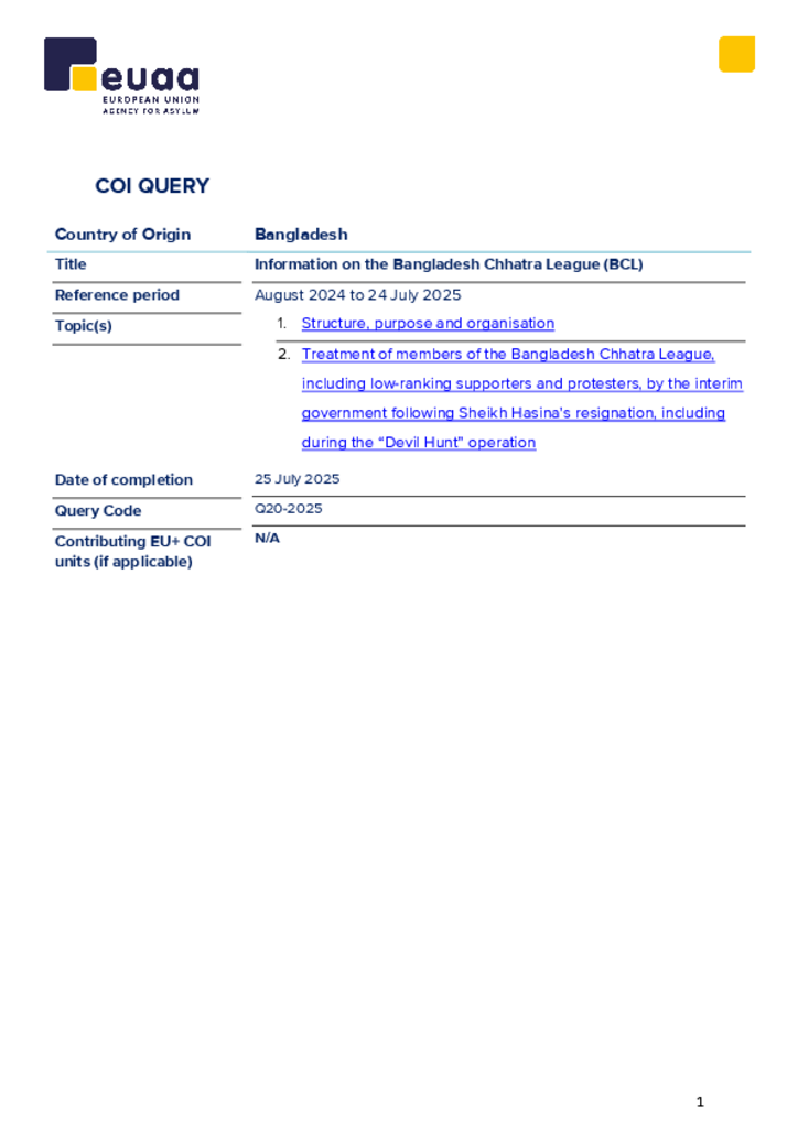 COI Query - Bangladesh: Information on the Bangladesh Chhatra League (BCL)