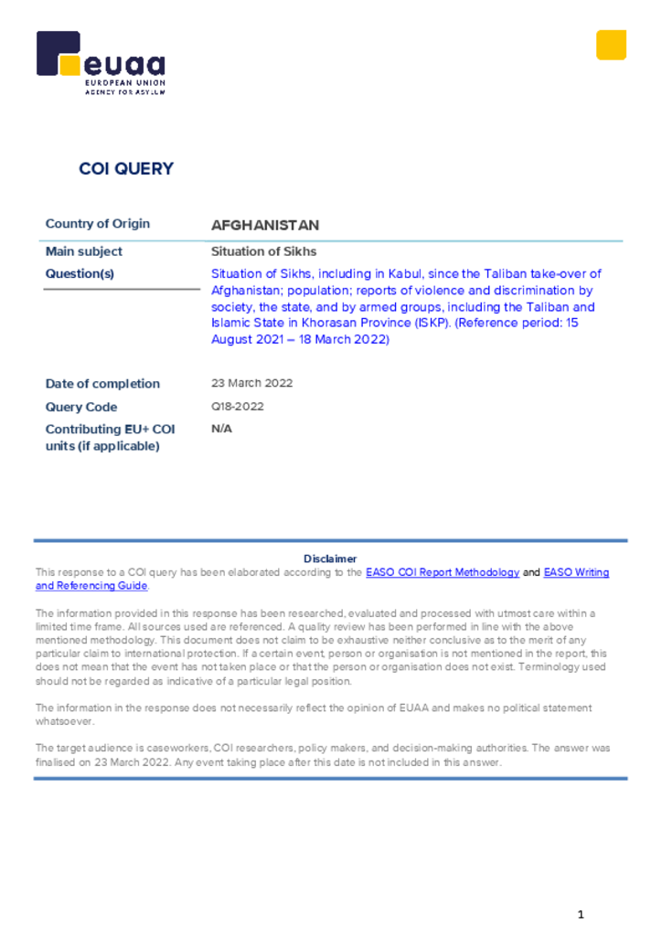 Reference period: 15 August 2021 – 18 March 2022; Situation of Sikhs, including in Kabul, since the Taliban take-over of Afghanistan; population; reports of violence and discrimination by society, the state, and by armed groups, including the Taliban and Islamic State in Khorasan Province (ISKP).