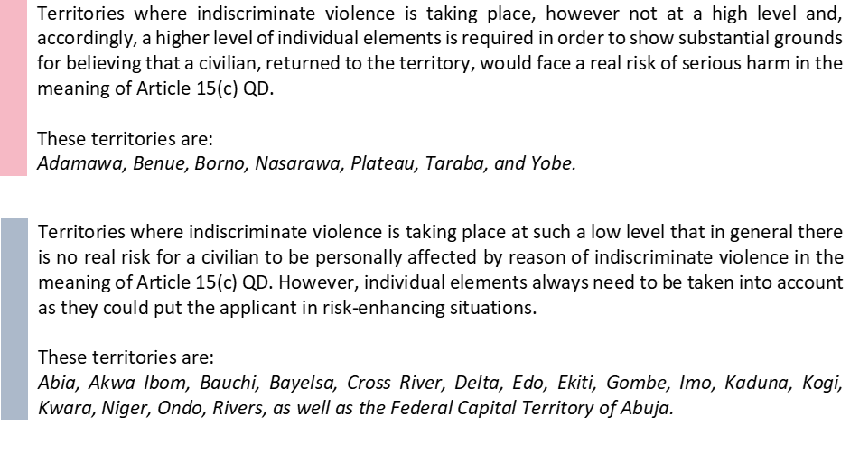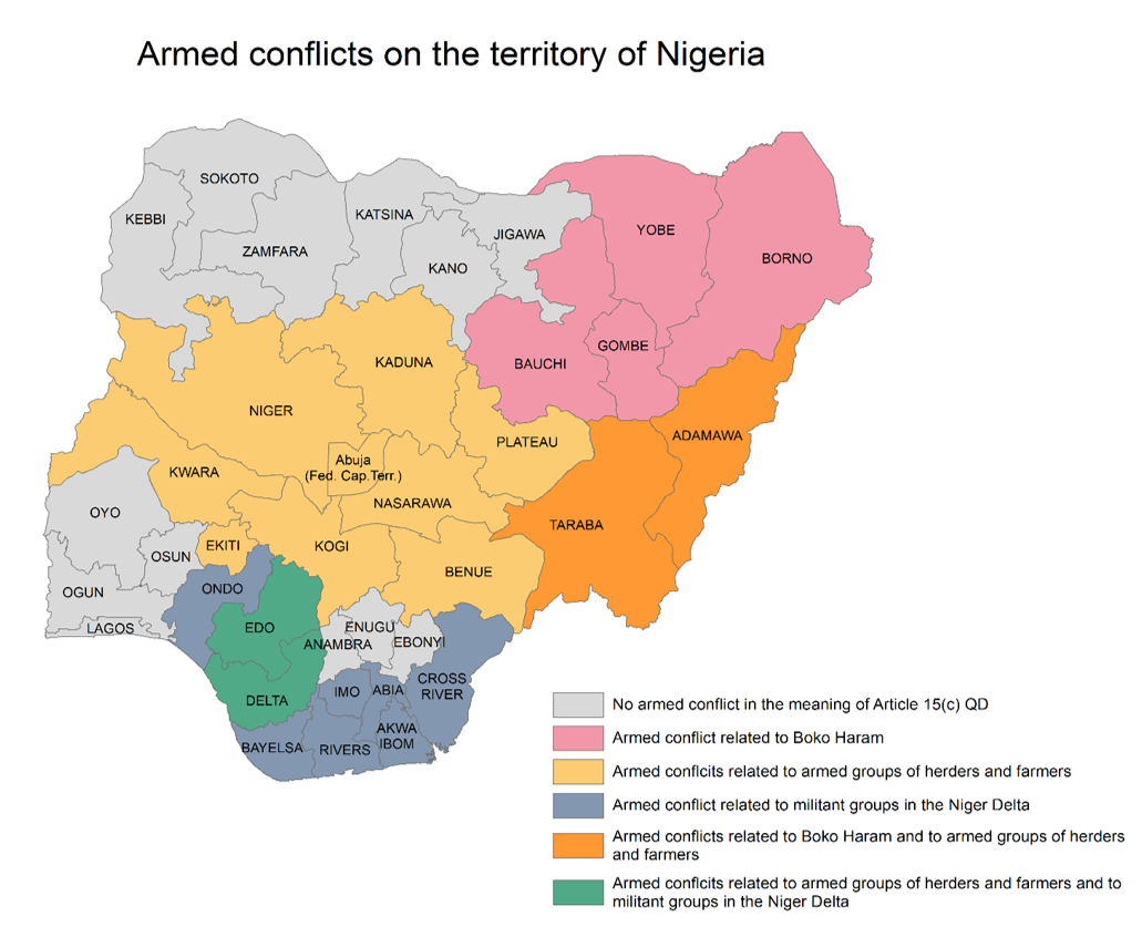 Applying the low threshold introduced with the Diakité judgment, it is found that several armed conflicts in the meaning of Article 15(c) QD take place in Nigeria, in particular on the territory of the following states: Abia, Adamawa, Akwa Ibom, Bauchi, Bayelsa, Benue, Borno, Cross River, Delta, Edo, Ekiti, Gombe, Imo, Kaduna, Kogi, Kwara, Nasarawa, Niger, Ondo, Plateau, Rivers, Taraba, Yobe, as well as the Federal Capital Territory of Abuja.