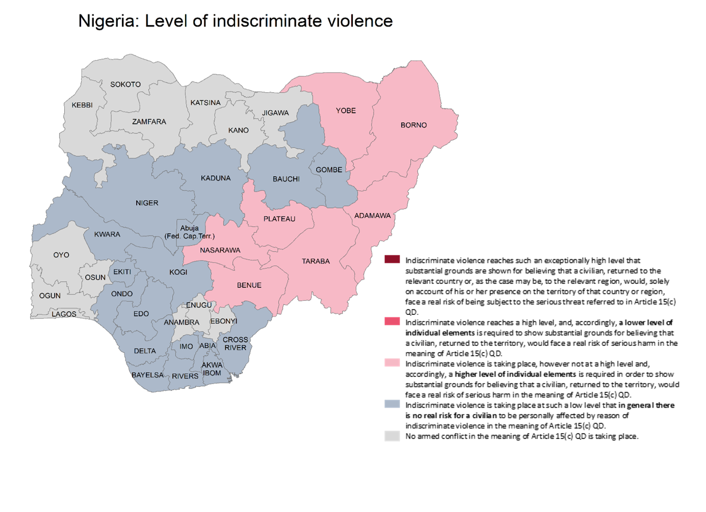 The map below summarises and illustrates the assessment of indiscriminate violence per state.