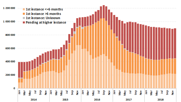 The overall rise in the stock of cases pending at first instance in the second half of 2018 was reflected only in cases pending for up to six months, whereas the number of applications awaiting a decision for a longer period declined slightly. This means that newly lodged applications contributed to the growth in the stock at first instance. This is in line with a slight decrease in the number of decisions issued at first instance in the second half of 2018 combined with a slight increase in the level of applications lodged.