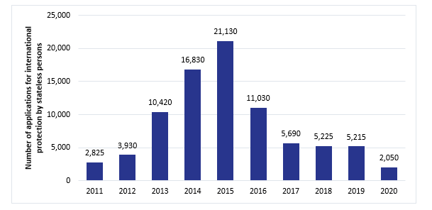 According to Eurostat data, EU+ countries have received approximately 84,500 applications for international protection by stateless persons during the last decade, from 2011 to 2020 (see Figure 4.20). On an annual basis, the highest number was received in 2015, with about 21,100 applications lodged by stateless persons. Since then, the number has decreased.
