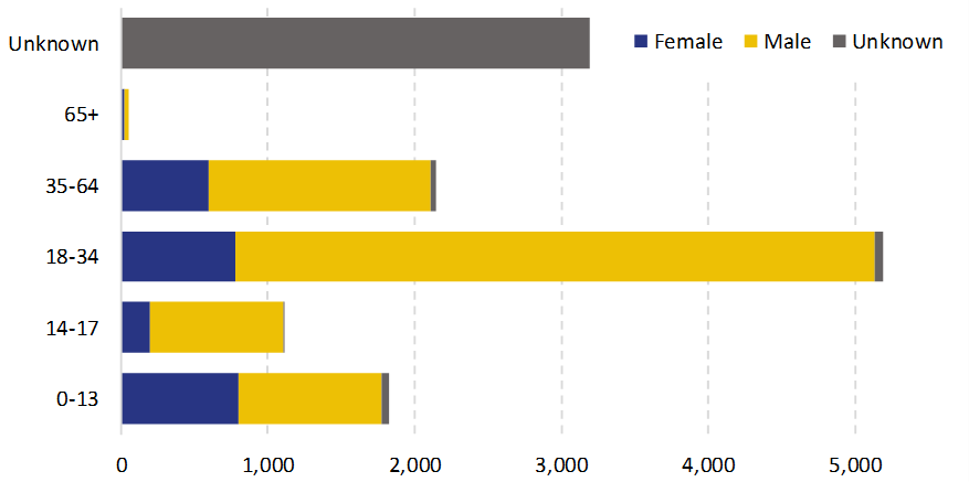 Men over the age of 18 accounted for the majority of transferees (see Figure 4.10). While the age group was not reported in 24% of transfers, minors represented at least 22% of all transferees in 2020. Although the overall number of minors who were transferred was lower than in 2019, their share of all transferees increased in 2020. Over four-fifths of minors over 14 years of age who were transferred between EU+ countries were male. In contrast, for minors younger than
