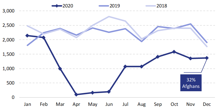 Most of the transferees in 2020 were nationals of Afghanistan, accounting for 17% of all persons who were transferred. This nationality was followed at some distance by Iraqis (7%), Nigerians (6%), Algerians and Syrians (5% each). Transfers involving these nationalities decreased when compared to 2019. However, the number of Afghan transferees decreased only slightly (- 6%), and in fact, a sharp increase in Afghan transfers was reported in the last months of 2020 (see Figure 4.8). It is noteworthy that Greece executed many more transfers of Afghans in 2020 than in 2019 (linked to relocations under Article 17(2)), particularly to France, Germany and Switzerland.