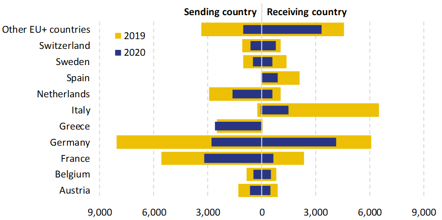 The situation was similar for countries receiving transfers. Almost all Member States received fewer transfers than in 2019 (see the right side of Figure 4.9), except for the UK (+4%).xxv The rise in the UK may be related to Brexit, with countries (primarily Greece and France) seeking to transfer as many people as possible before the Dublin III Regulation no longer applies to the UK.