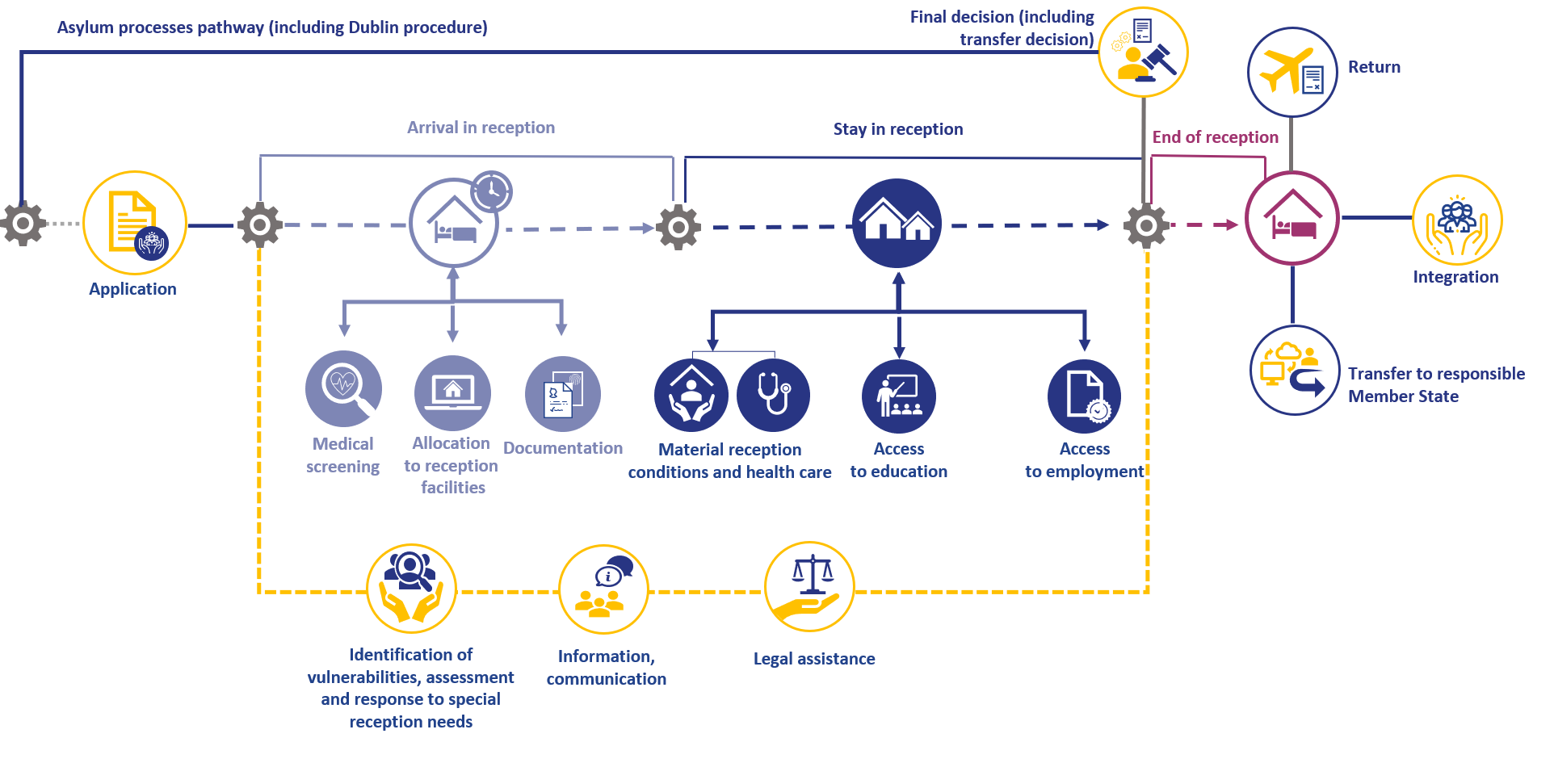 Disclaimer: The reception process and entitlements are intrinsically linked to the asylum procedure and pathway. The depicted three phases of reception are a simplified representation, showcasing the rights and obligations of applicants for international protection according to the EU asylum acquis. It does not necessarily cover all existing systems in EU+ countries.