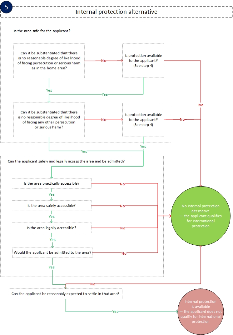 Home EASO Practical Guide: Qualification for international protection Flowcharts Internal protection alternative Table of contents Table of Contents Introduction Checklists Guidance General principles Legal framework Individual circumstances Decision-making process ‘Outside the country of origin’: Personal and territorial scope Personal and territorial scope Third-country national Stateless person Importance of determining the country of origin Outside the country of origin Refugee status Persecution and well-founded fear Persecution 1. Is the act a sufficiently severe violation of human rights, taking one of the following forms? 2. Is the act a violation of a non-derogable human right or a sufficiently severe violation of another basic human right? 3. Can the treatment be considered as the accumulation of various measures, the consequences of which would affect the applicant in a similar manner? Well-founded fear Reasons for persecution Race Religion Nationality Membership of a particular social group Common characteristic Perception of distinct identity Political opinion Nexus/(for reasons of) Subsidiary protection Real risk Serious harm Article 15(a) QD Article 15(b) QD Torture Inhuman or degrading treatment or punishment Article 15(c) QD International or internal armed conflict Civilian Indiscriminate violence Serious and individual threat Life or person Nexus (by reason of) International protection needs arising sur place Actors of persecution or serious harm Protection in the country of origin Actors of protection Quality of protection Effectiveness Non-temporary nature Accessibility Internal protection alternative Safety in a part of the country of origin Access to part of the country of origin Reasonableness for the applicant to settle in a part of the country of origin Unwillingness to avail of the protection of the country of origin Flowcharts Preliminary considerations: personal and territorial scope Persecution Well-founded fear Reason for persecution Subsidiary protection Protection in the country of origin Internal protection alternative References Abbreviations and useful links Other resources Legal references and relevant case-law General principles Personal and territorial scope Refugee status: well-founded fear of persecution Reasons for persecution: race Reasons for persecution: religion Reasons for persecution: nationality Reasons for persecution: membership of a particular social group Reasons for persecution: political opinion Nexus (for reasons of) Subsidiary protection: real risk of serious harm Subsidiary protection: death penalty or execution Subsidiary protection: torture or inhuman or degrading treatment or punishment Subsidiary protection: serious and individual threat to a civilian’s life or person by reason of indiscriminate violence in situations of international or internal armed conflict International protection needs arising sur place Actors of persecution or serious harm Actors of protection and quality of protection Internal protection alternative Citation Please cite as: EUAA, 'Internal protection alternative' in EASO Practical Guide: Qualification for international protection, January 2022. Copy Share Print Book traversal links for Internal protection alternative Previous Parent Next