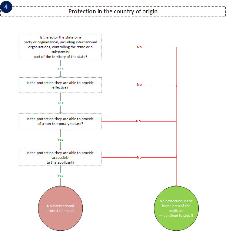Home EASO Practical Guide: Qualification for international protection Flowcharts Protection in the country of origin Table of contents Table of Contents Introduction Checklists Guidance General principles Legal framework Individual circumstances Decision-making process ‘Outside the country of origin’: Personal and territorial scope Personal and territorial scope Third-country national Stateless person Importance of determining the country of origin Outside the country of origin Refugee status Persecution and well-founded fear Persecution 1. Is the act a sufficiently severe violation of human rights, taking one of the following forms? 2. Is the act a violation of a non-derogable human right or a sufficiently severe violation of another basic human right? 3. Can the treatment be considered as the accumulation of various measures, the consequences of which would affect the applicant in a similar manner? Well-founded fear Reasons for persecution Race Religion Nationality Membership of a particular social group Common characteristic Perception of distinct identity Political opinion Nexus/(for reasons of) Subsidiary protection Real risk Serious harm Article 15(a) QD Article 15(b) QD Torture Inhuman or degrading treatment or punishment Article 15(c) QD International or internal armed conflict Civilian Indiscriminate violence Serious and individual threat Life or person Nexus (by reason of) International protection needs arising sur place Actors of persecution or serious harm Protection in the country of origin Actors of protection Quality of protection Effectiveness Non-temporary nature Accessibility Internal protection alternative Safety in a part of the country of origin Access to part of the country of origin Reasonableness for the applicant to settle in a part of the country of origin Unwillingness to avail of the protection of the country of origin Flowcharts Preliminary considerations: personal and territorial scope Persecution Well-founded fear Reason for persecution Subsidiary protection Protection in the country of origin Internal protection alternative References Abbreviations and useful links Other resources Legal references and relevant case-law General principles Personal and territorial scope Refugee status: well-founded fear of persecution Reasons for persecution: race Reasons for persecution: religion Reasons for persecution: nationality Reasons for persecution: membership of a particular social group Reasons for persecution: political opinion Nexus (for reasons of) Subsidiary protection: real risk of serious harm Subsidiary protection: death penalty or execution Subsidiary protection: torture or inhuman or degrading treatment or punishment Subsidiary protection: serious and individual threat to a civilian’s life or person by reason of indiscriminate violence in situations of international or internal armed conflict International protection needs arising sur place Actors of persecution or serious harm Actors of protection and quality of protection Internal protection alternative Citation Please cite as: EUAA, 'Protection in the country of origin' in EASO Practical Guide: Qualification for international protection, January 2022. Copy Share Print Book traversal links for Protection in the country of origin Previous Parent Next