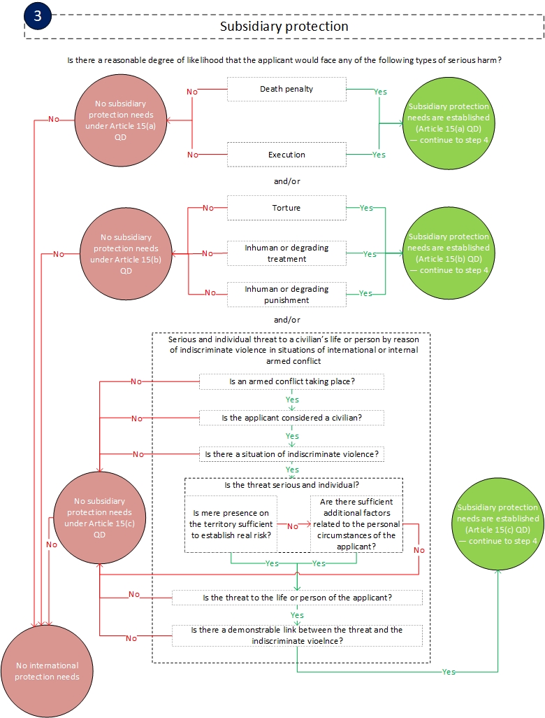 Home EASO Practical Guide: Qualification for international protection Flowcharts Subsidiary protection Table of contents Table of Contents Introduction Checklists Guidance General principles Legal framework Individual circumstances Decision-making process ‘Outside the country of origin’: Personal and territorial scope Personal and territorial scope Third-country national Stateless person Importance of determining the country of origin Outside the country of origin Refugee status Persecution and well-founded fear Persecution 1. Is the act a sufficiently severe violation of human rights, taking one of the following forms? 2. Is the act a violation of a non-derogable human right or a sufficiently severe violation of another basic human right? 3. Can the treatment be considered as the accumulation of various measures, the consequences of which would affect the applicant in a similar manner? Well-founded fear Reasons for persecution Race Religion Nationality Membership of a particular social group Common characteristic Perception of distinct identity Political opinion Nexus/(for reasons of) Subsidiary protection Real risk Serious harm Article 15(a) QD Article 15(b) QD Torture Inhuman or degrading treatment or punishment Article 15(c) QD International or internal armed conflict Civilian Indiscriminate violence Serious and individual threat Life or person Nexus (by reason of) International protection needs arising sur place Actors of persecution or serious harm Protection in the country of origin Actors of protection Quality of protection Effectiveness Non-temporary nature Accessibility Internal protection alternative Safety in a part of the country of origin Access to part of the country of origin Reasonableness for the applicant to settle in a part of the country of origin Unwillingness to avail of the protection of the country of origin Flowcharts Preliminary considerations: personal and territorial scope Persecution Well-founded fear Reason for persecution Subsidiary protection Protection in the country of origin Internal protection alternative References Abbreviations and useful links Other resources Legal references and relevant case-law General principles Personal and territorial scope Refugee status: well-founded fear of persecution Reasons for persecution: race Reasons for persecution: religion Reasons for persecution: nationality Reasons for persecution: membership of a particular social group Reasons for persecution: political opinion Nexus (for reasons of) Subsidiary protection: real risk of serious harm Subsidiary protection: death penalty or execution Subsidiary protection: torture or inhuman or degrading treatment or punishment Subsidiary protection: serious and individual threat to a civilian’s life or person by reason of indiscriminate violence in situations of international or internal armed conflict International protection needs arising sur place Actors of persecution or serious harm Actors of protection and quality of protection Internal protection alternative Citation Please cite as: EUAA, 'Subsidiary protection' in EASO Practical Guide: Qualification for international protection, January 2022. Copy Share Print Book traversal links for Subsidiary protection Previous Parent Next
