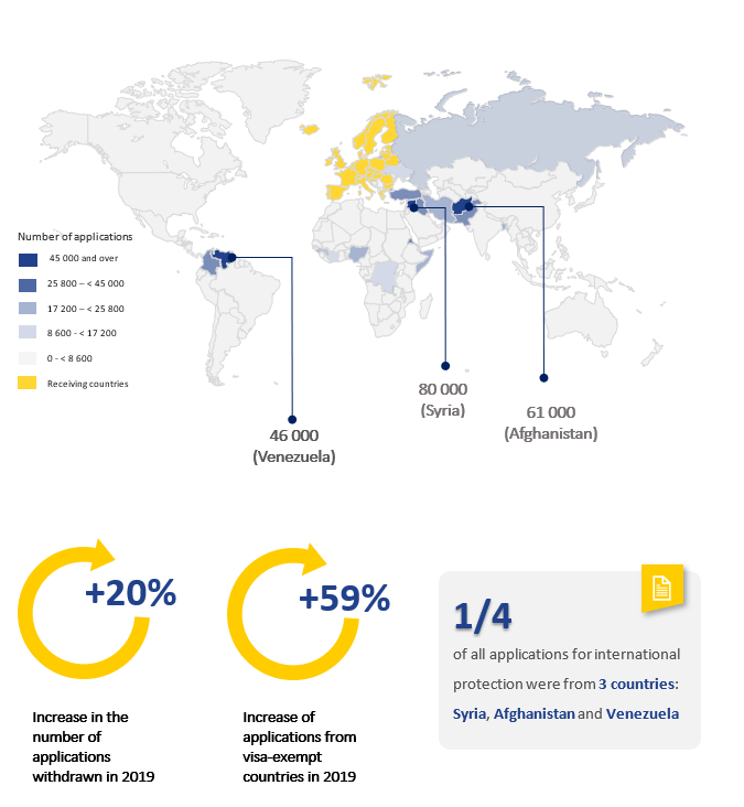Three countries of origin accounted for one-quarter of all applications for international protection in EU+ countries in 2019. In absolute numbers, applicants from Syria lodged about 80 000 applications, followed by Afghanistan (about 61 000) and Venezuela (about 46 000). Often language, cultural connections or geographical proximity can play a role in where an application is lodged. This was typically the case for Latin Americans (Venezuelans and Colombians, but also nationals of Guatemala, Honduras and Nicaragua) who lodged applications primarily in Spain. Visa-free travel may also play a role in where an application is lodged. A significant new trend in 2019 was an increase in the number of applications lodged by citizens of countries who do not need a visa to enter the Schengen area, which accounted for more than one-quarter of all applications (about 188 500).