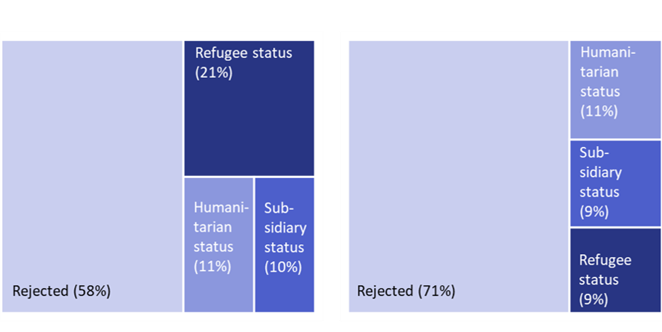 In 2020, the EU+ recognition rate for first instance decisions on asylum applications was 42%: out of 534,500 decisions issued, 224,000 were positive and the applicant was granted a form of protection. Most positive decisions at first instance granted refugee status (113,000 or one-half of all positive decisions). Subsidiary protection was granted in about 52,000 cases (23% of all positive decisions), while humanitarian status was granted in 59,000 cases (27% of all positive decisions) (see Figure 2).