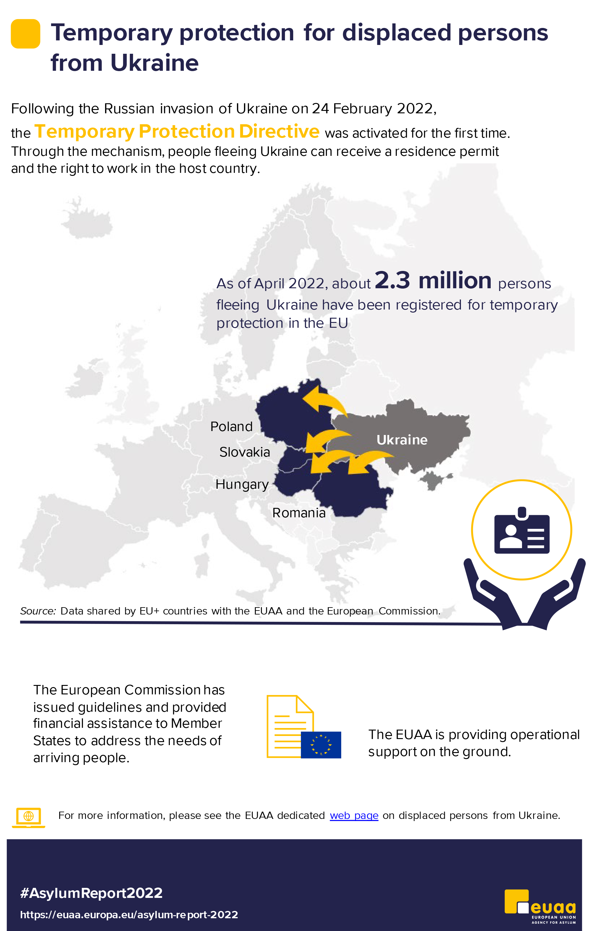 Home Executive Summary of the Asylum Report 2022 Temporary protection for displaced persons from Ukraine Table of contents Table of Contents Foreword Introduction 1. Global developments in the field of asylum 2. Major developments in asylum in the European Union Temporary protection for displaced persons from Ukraine 3. EASO transition to the EUAA 4. Functioning of the Common European Asylum System 4.1. Access to the asylum procedure 4.2. The Dublin procedure 4.3. Special procedures to assess protection needs 4.4. Processing asylum applications at first instance Profile of asylum applicants arriving in EU+ countries 4.5. Processing asylum applications at second or higher instance 4.6. Pending cases 4.7. Reception of applicants for international protection Reception capacity to accommodate applicants for international protection 4.8. Detention during the asylum procedure 4.9. Access to information 4.10. Legal assistance and representation 4.11. Interpretation services 4.12. Country of origin information 4.13. Statelessness in the context of asylum 4.14. Content of protection 4.15. Return of former applicants Ensuring family unity 4.16. Resettlement and humanitarian admissions 5. Children and people with special needs in the asylum procedure Unaccompanied minors seeking protection Concluding remarks Citation Please cite as: EUAA, 'Temporary protection for displaced persons from Ukraine' in Executive Summary of the Asylum Report 2022, May 2022. Copy Share Print Download PDF PNG Book traversal links for Temporary protection for displaced persons from Ukraine Previous Parent Next