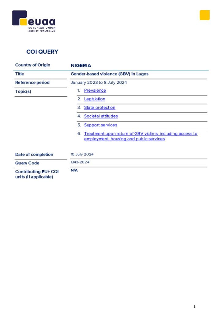 Reference period: January 2023 to 8 July 2024; 1. Prevalence; 2. Legislation; 3. State protection; 4. Societal attitudes; 5. Support services; 6. Treatment upon return of GBV victims, including access to employment, housing and public services.