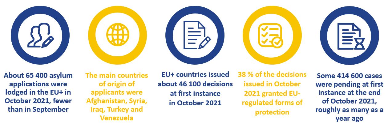 Analysis released by the European Asylum Support Office (EASO) shows that about 65 400 applications for international protection were lodged in the EU+ in October 2021, down by 8 % from September. While this was the first decline after five months of continuously rising applications, it might not signal a trend reversal because it primarily reflected the change in applications by Afghans. Total applications in October were still the second highest since the outbreak of COVID-19 in Europe and roughly on par with the immediate pre-pandemic levels.