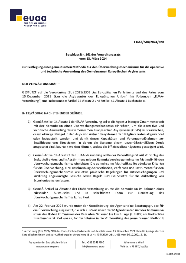 Beschluss Nr. 161 des Verwaltungsrats vom 13. März 2024 zur Festlegung einer gemeinsamen Methodik für den Überwachungsmechanismus für die operative und technische Anwendung des Gemeinsamen Europäischen Asylsystems