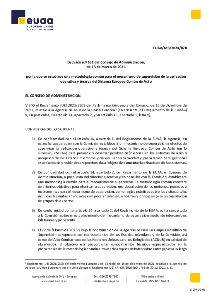 Decisión n.º 161 del Consejo de Administración, de 13 de marzo de 2024 por la que se establece una metodología común para el mecanismo de supervisión de la aplicación operativa y técnica del Sistema Europeo Común de Asilo