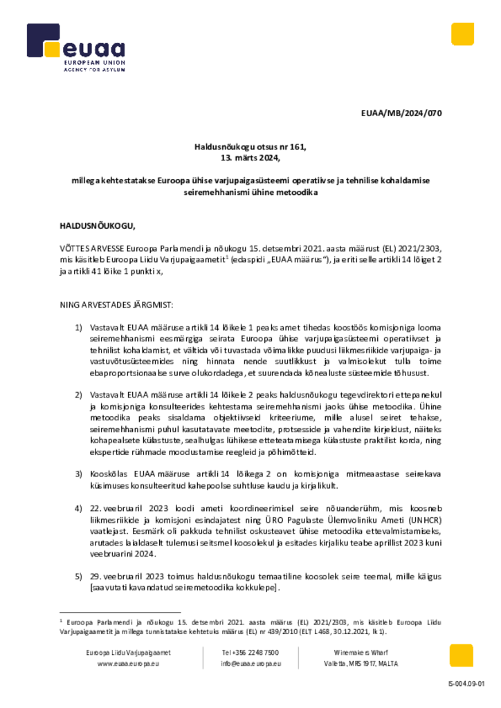Haldusnõukogu otsus nr 161, 13. märts 2024, millega kehtestatakse Euroopa ühise varjupaigasüsteemi operatiivse ja tehnilise kohaldamise seiremehhanismi ühine metoodika