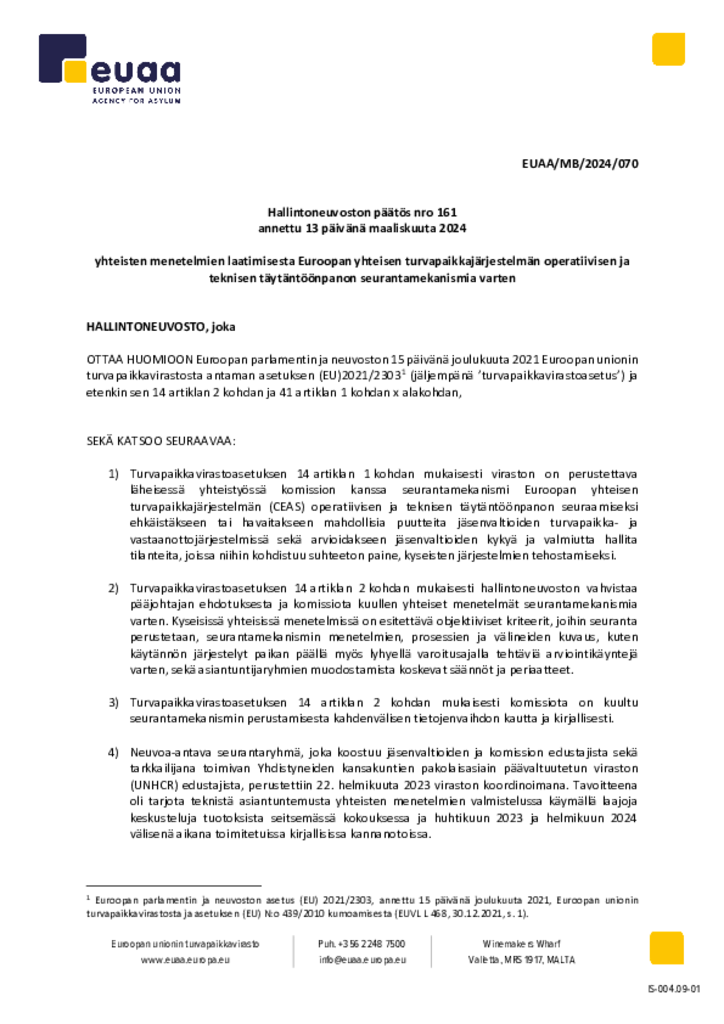 Hallintoneuvoston päätös nro 161 annettu 13 päivänä maaliskuuta 2024 yhteisten menetelmien laatimisesta Euroopan yhteisen turvapaikkajärjestelmän operatiivisen ja teknisen täytäntöönpanon seurantamekanismia varten