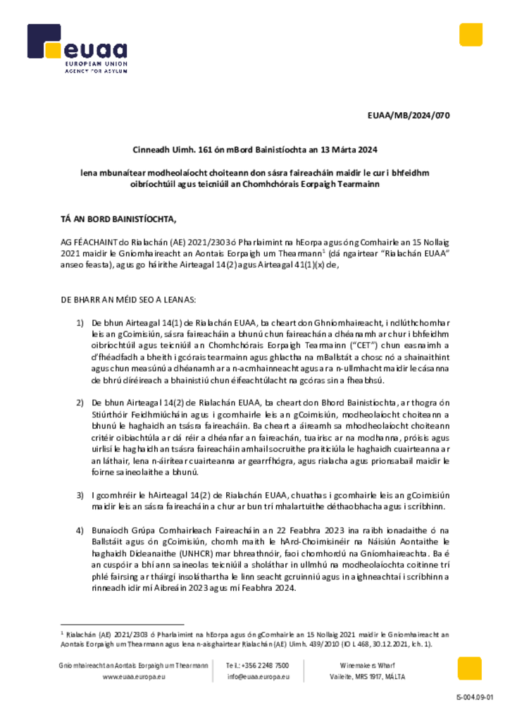Cinneadh Uimh. 161 ón mBord Bainistíochta an 13 Márta 2024 - Modheolaíocht choiteann le haghaidh an tsásra faireacháin ar chur i bhfeidhm oibríochtúil agus teicniúil Chomhchórais Eorpaigh Tearmainn