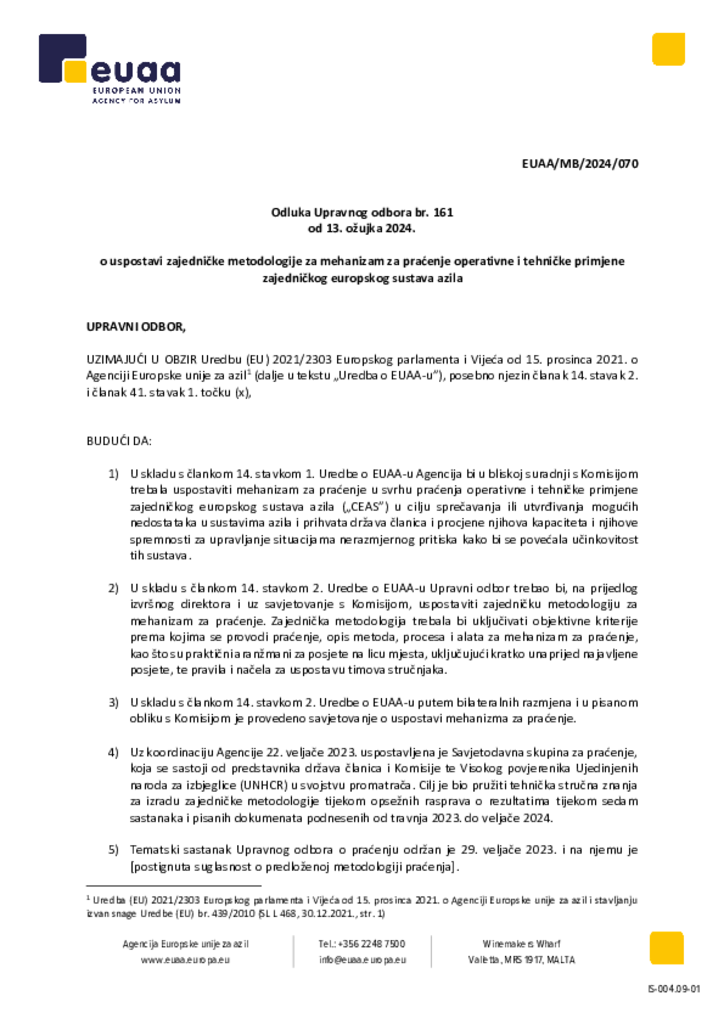 Odluka Upravnog odbora br. 161 od 13. ožujka 2024. - Zajednička metodologija za mehanizam za praćenje operativne i tehničke primjene primjene zajedničkog europskog sustava azila