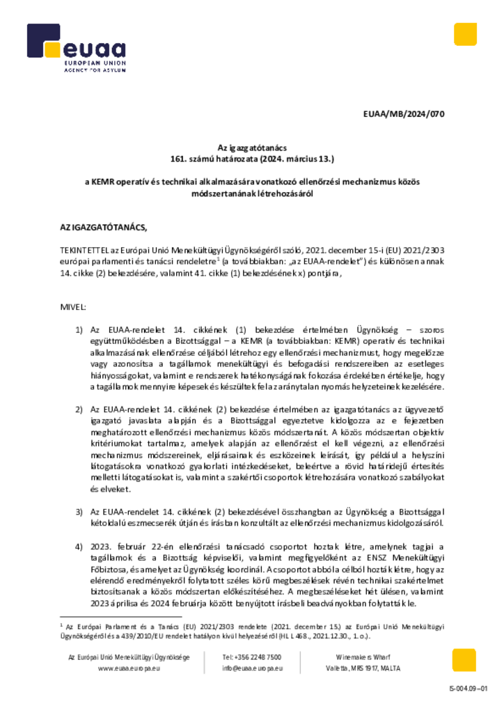 Az igazgatótanács 161. számú határozata (2024. március 13.) - A KEMR operatív és technikai alkalmazására vonatkozó ellenőrzési mechanizmus közös módszertana