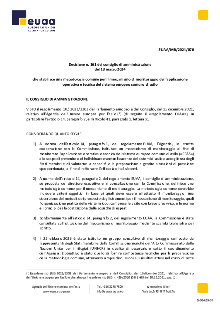 Decisione n. 161 del consiglio di amministrazione del 13 marzo 2024 che stabilisce una metodologia comune per il meccanismo di monitoraggio dell’applicazione operativa e tecnica del sistema europeo comune di asilo