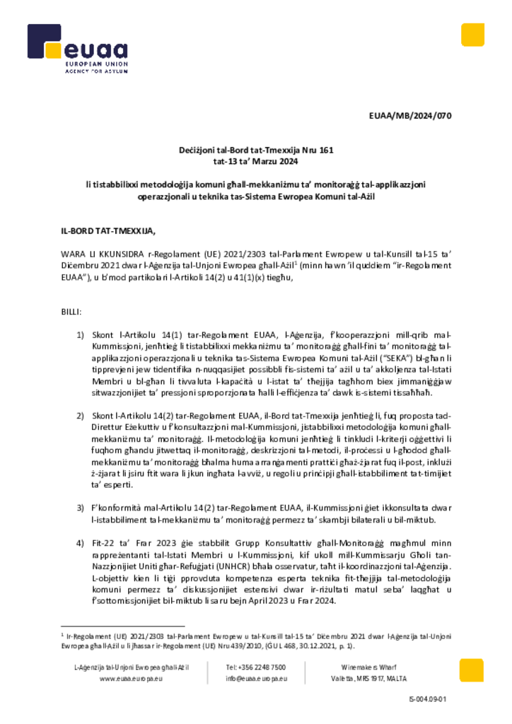 Deċiżjoni tal-Bord tat-Tmexxija Nru 161 tat-13 ta’ Marzu 2024 - Metodoloġija komuni għall-mekkaniżmu ta’ monitoraġġ tal-applikazzjoni operazzjonali u teknika tas-Sistema Ewropea Komuni tal-Ażil