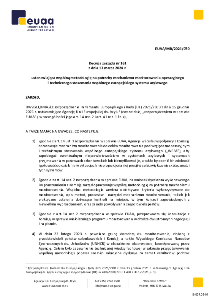 Decyzja zarządu nr 161 z dnia 13 marca 2024 r. ustanawiająca wspólną metodologię na potrzeby mechanizmu monitorowania operacyjnego i technicznego stosowania wspólnego europejskiego systemu azylowego