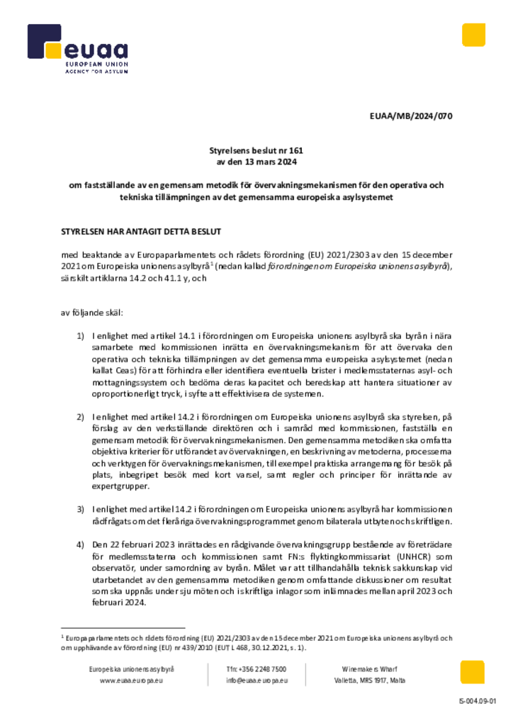 Styrelsens beslut nr 161 av den 13 mars 2024 om fastställande av en gemensam metodik för övervakningsmekanismen för den operativa och tekniska tillämpningen av det gemensamma europeiska asylsystemet