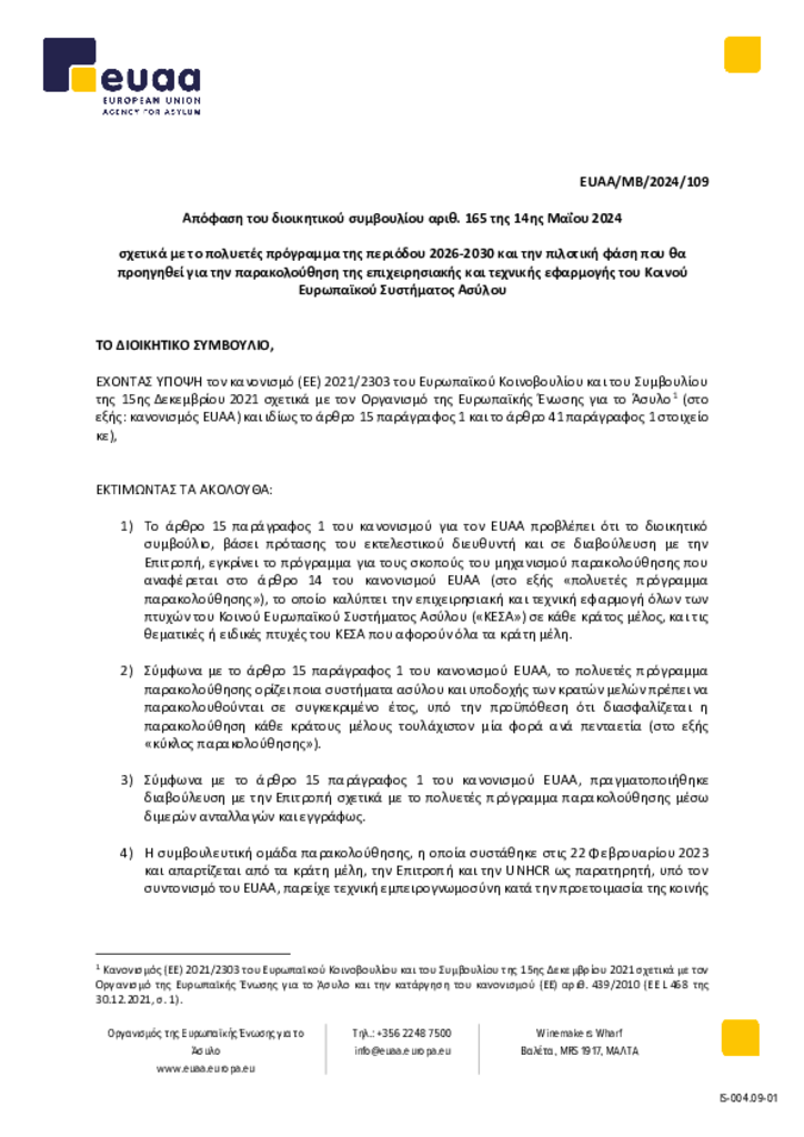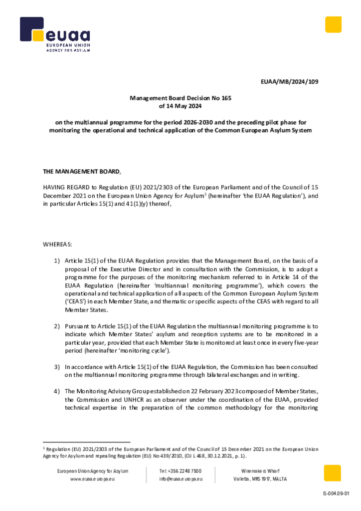 Deċiżjoni tal-Bord tat-Tmexxija Nru 165 tal-14 ta’ Mejju 2024 dwar il-programm pluriennali għall-perjodu 2026-2030 u l-fażi pilota preċedenti għall-monitoraġġ tal-applikazzjoni operazzjonali u teknika tas-Sistema Ewropea Komuni tal-Ażil