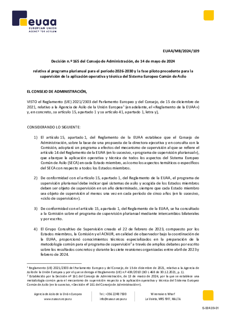 Decisión n.º 165 del Consejo de Administración, de 14 de mayo de 2024 relativa al programa plurianual para el período 2026-2030 y la fase piloto precedente para la supervisión de la aplicación operativa y técnica del Sistema Europeo Común de Asilo