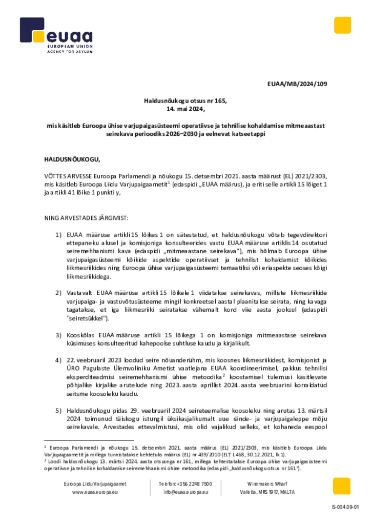 Haldusnõukogu otsus nr 165, 14. mai 2024, mis käsitleb Euroopa ühise varjupaigasüsteemi operatiivse ja tehnilise kohaldamise mitmeaastast seirekava perioodiks 2026–2030 ja eelnevat katseetappi