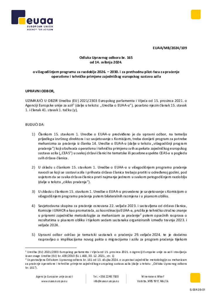 Odluka Upravnog odbora br. 165 od 14. svibnja 2024. o višegodišnjem programu za razdoblje 2026. – 2030. i za prethodnu pilot-fazu za praćenje operativne i tehničke primjene zajedničkog europskog sustava azila